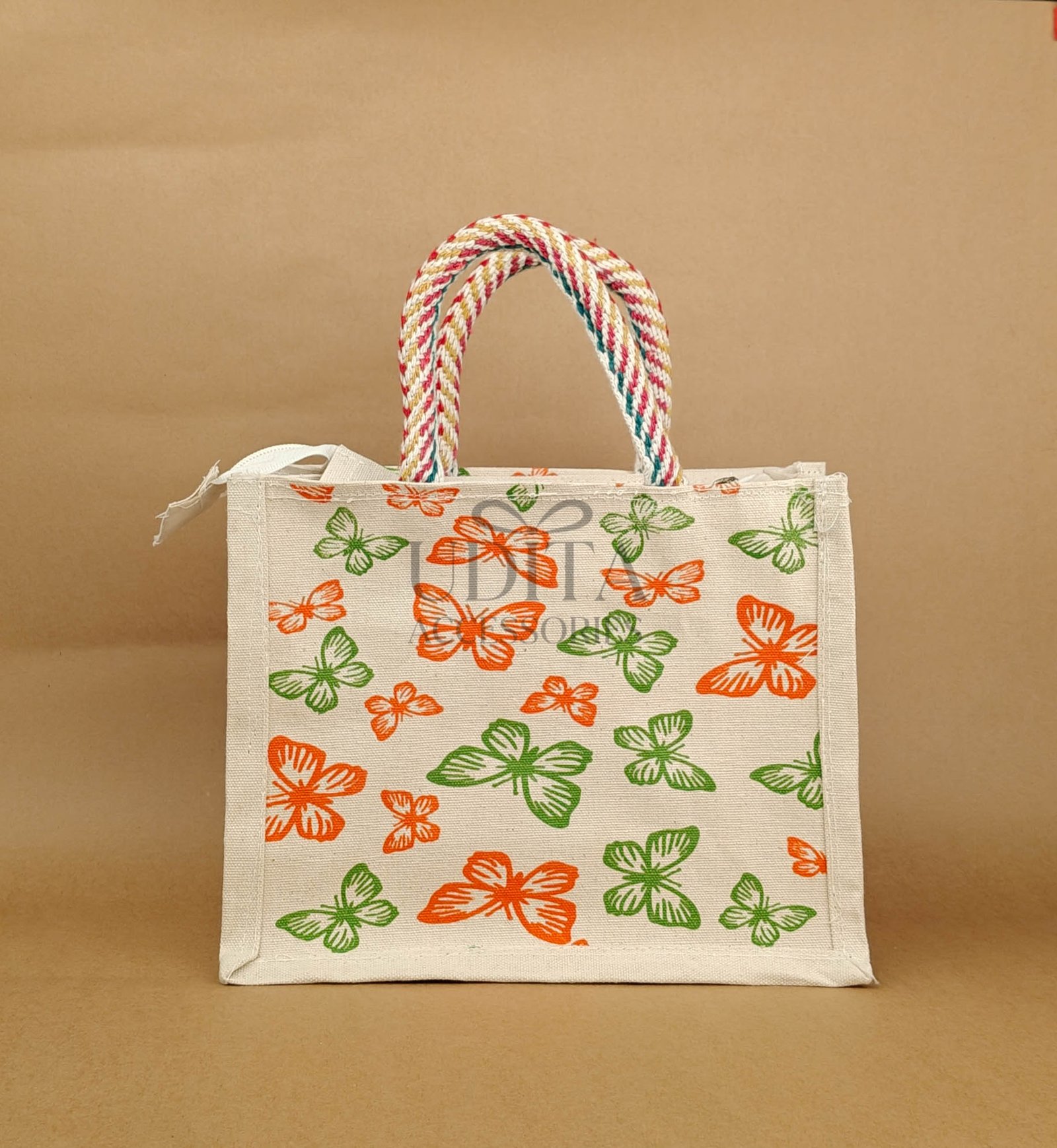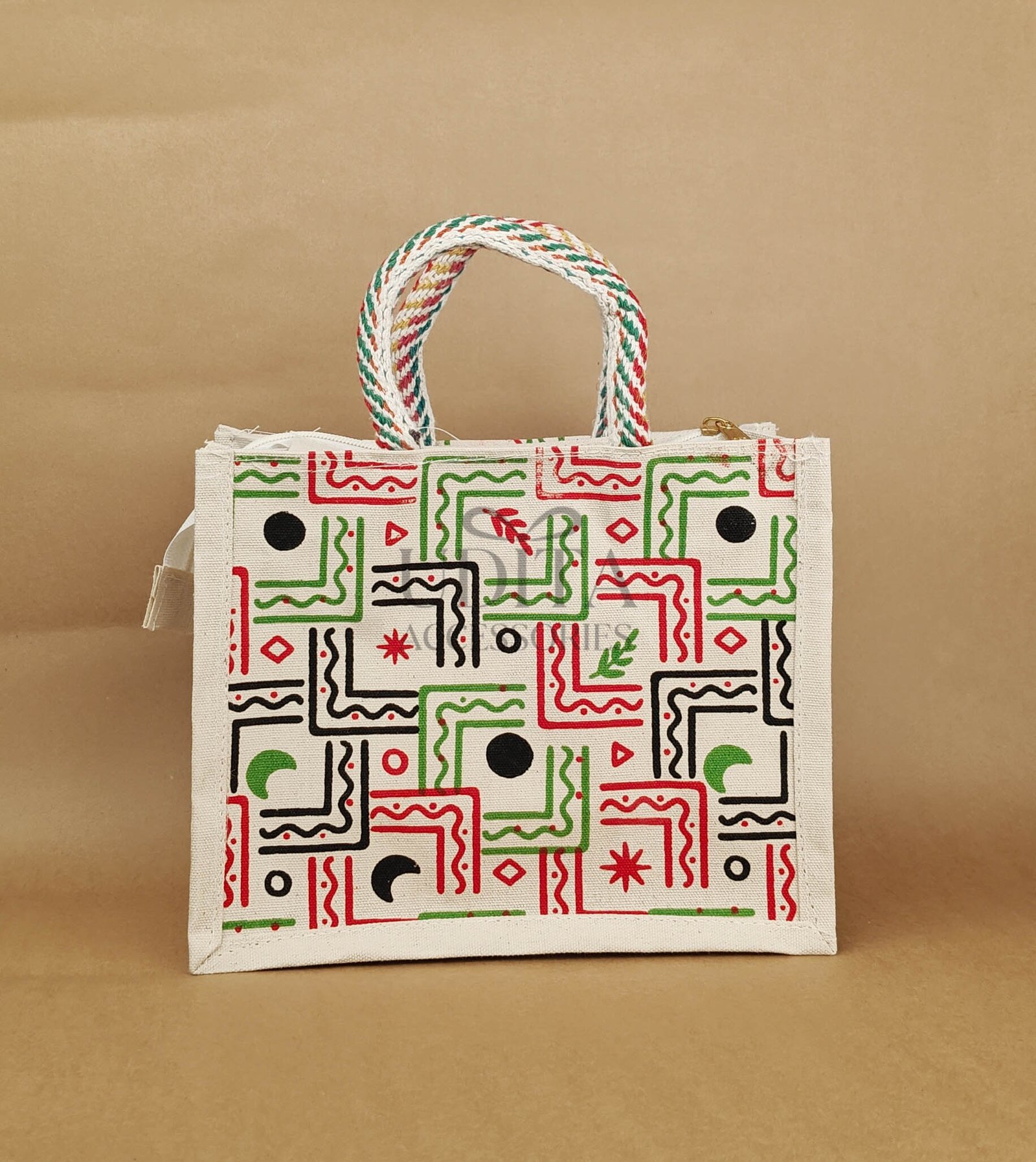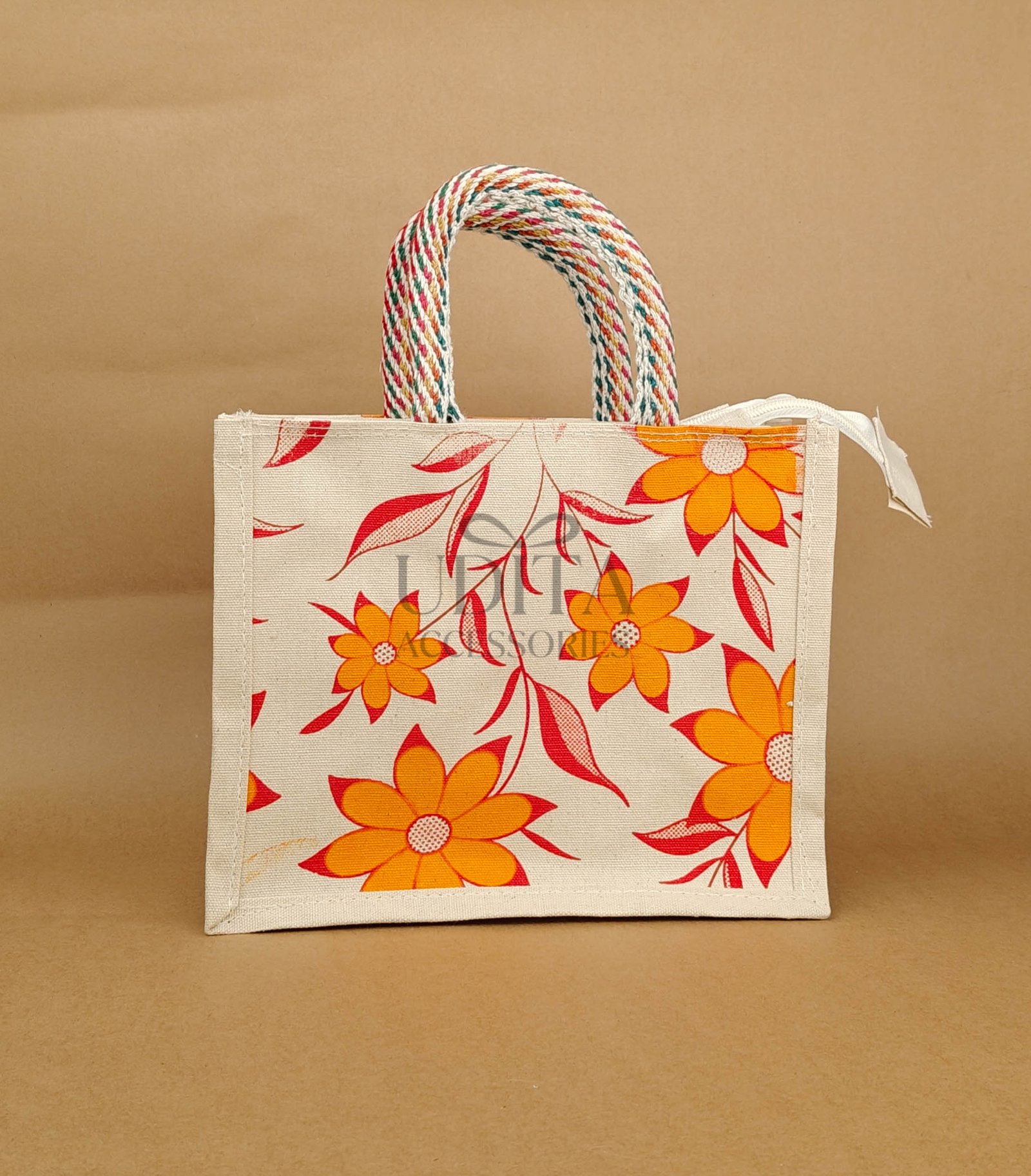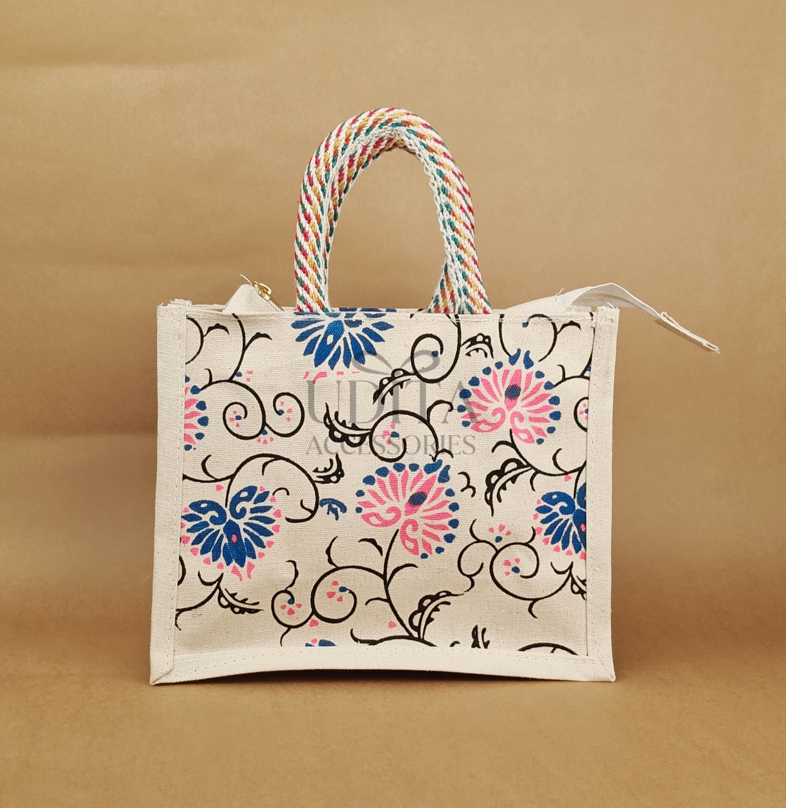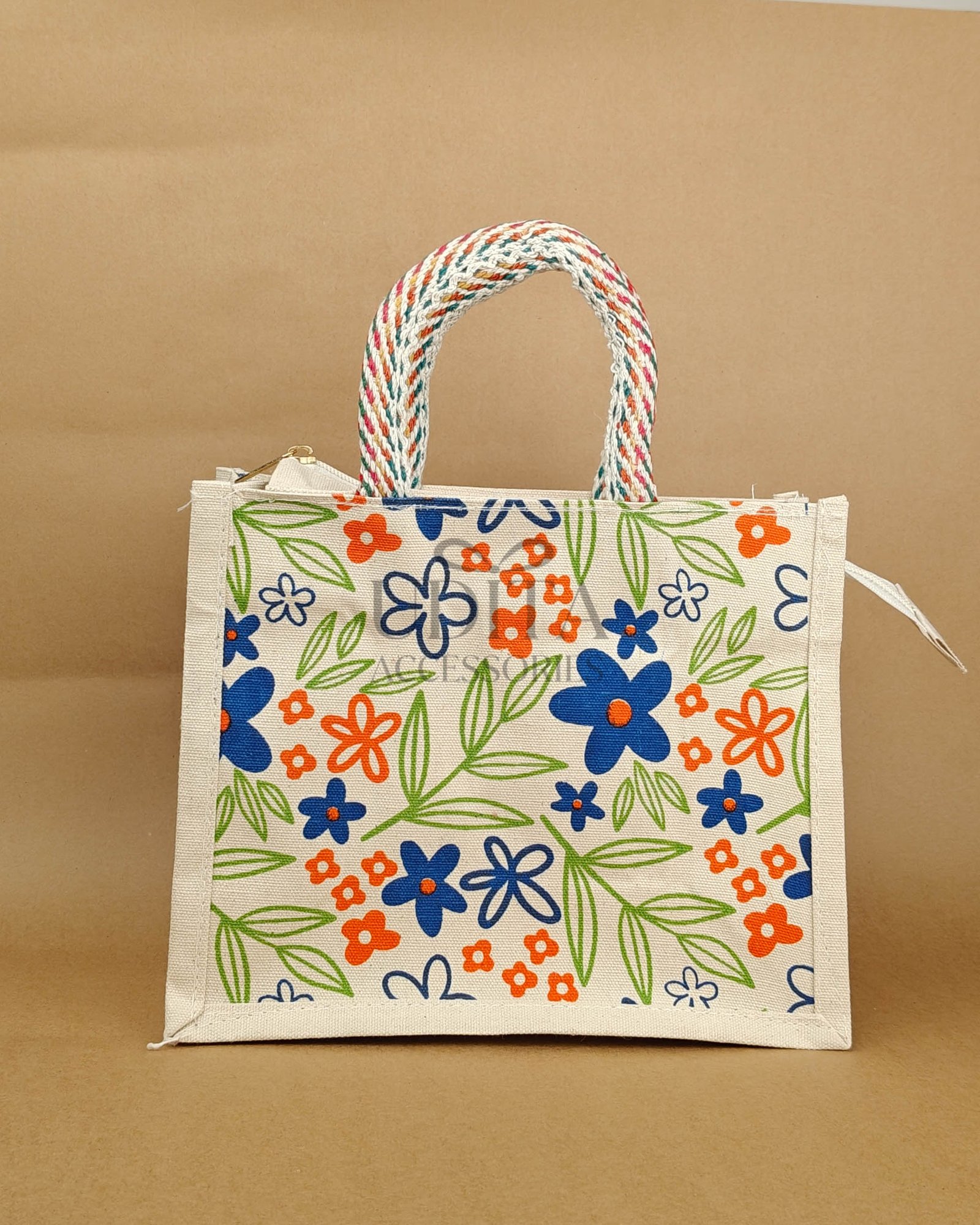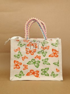 A strong jute bag designed with a convenient zip closure.