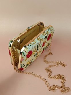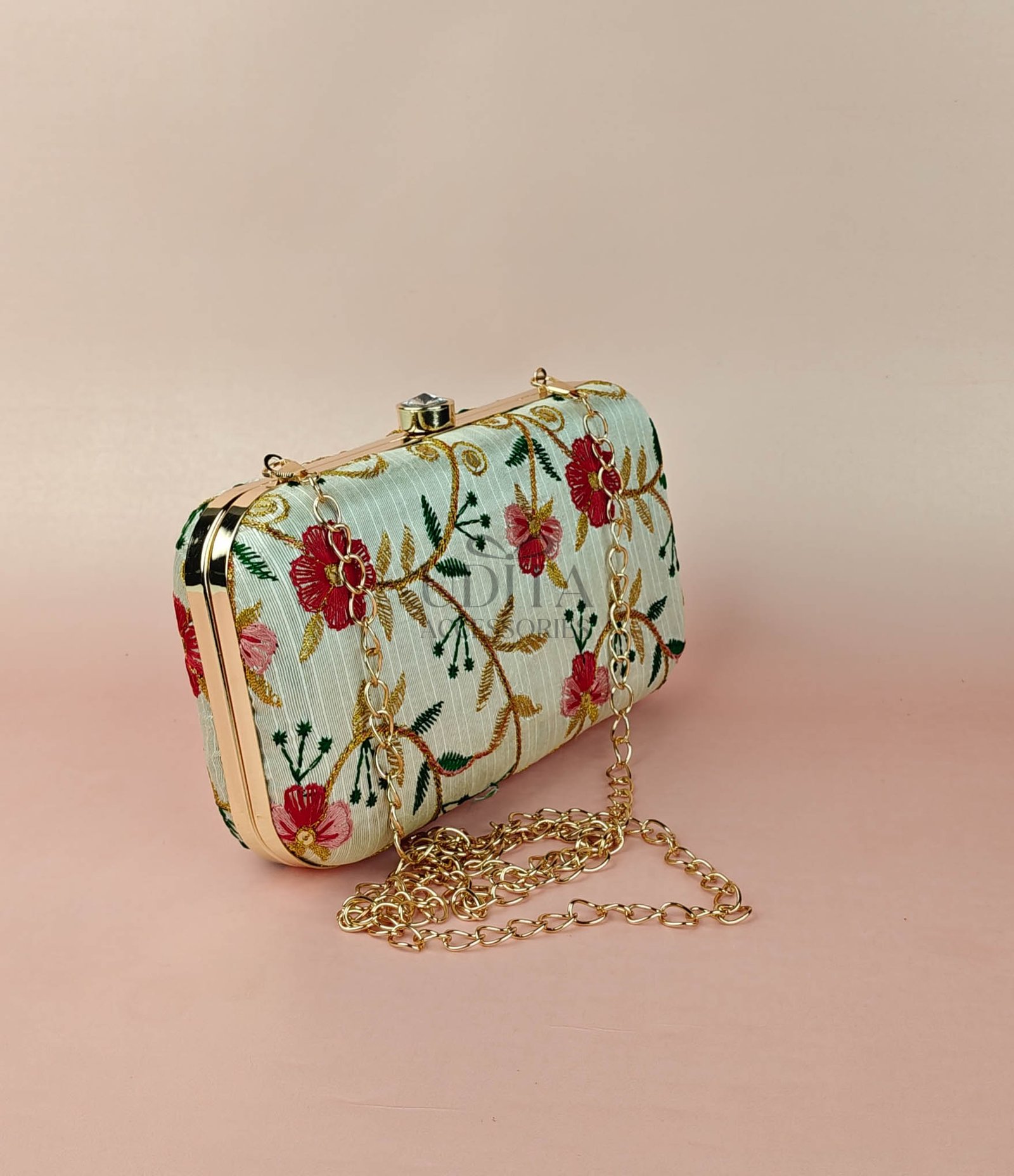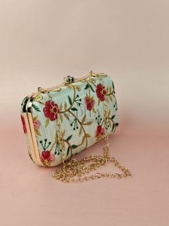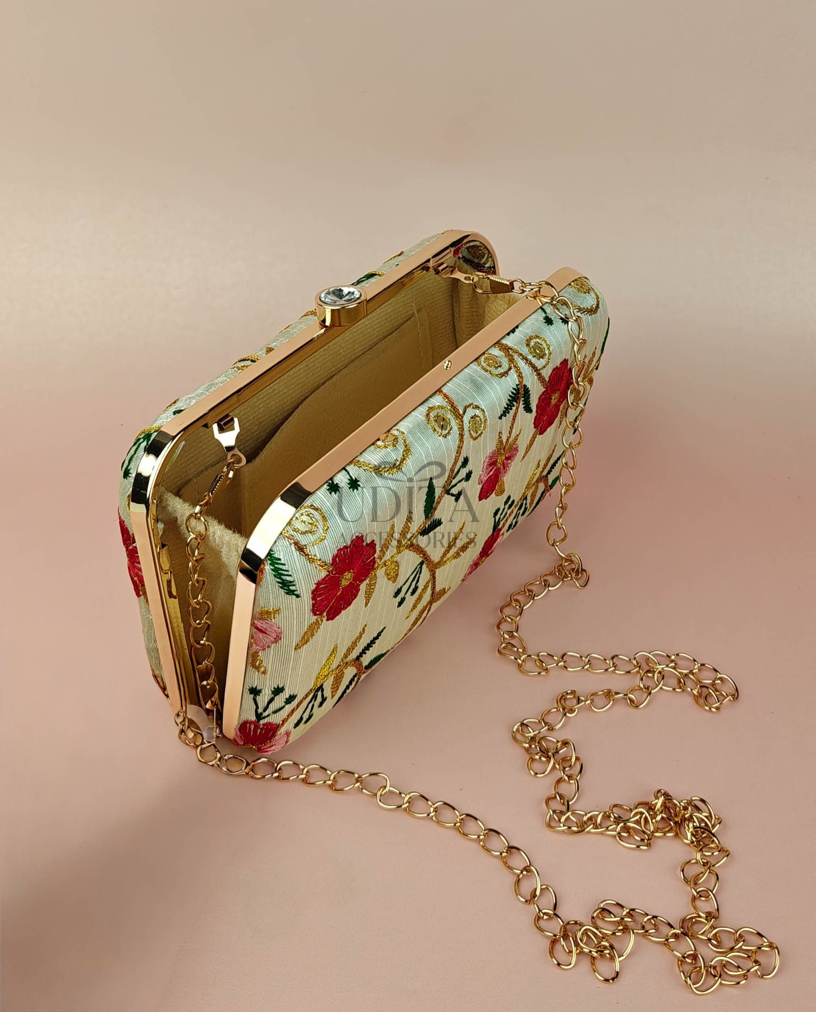 A beautifully embroidered clutch with rich threadwork and elegant detailing.