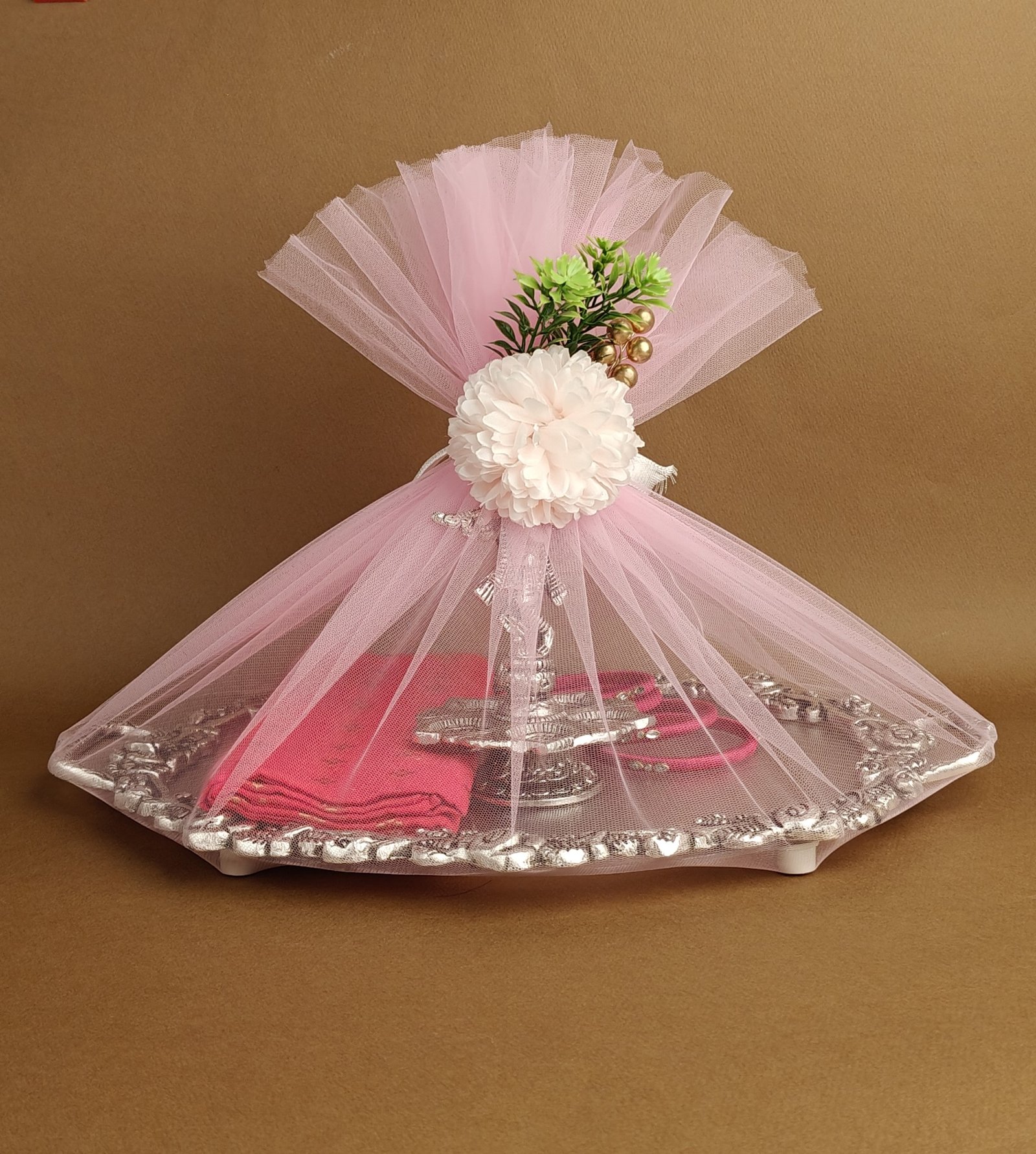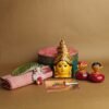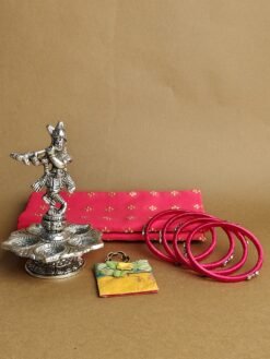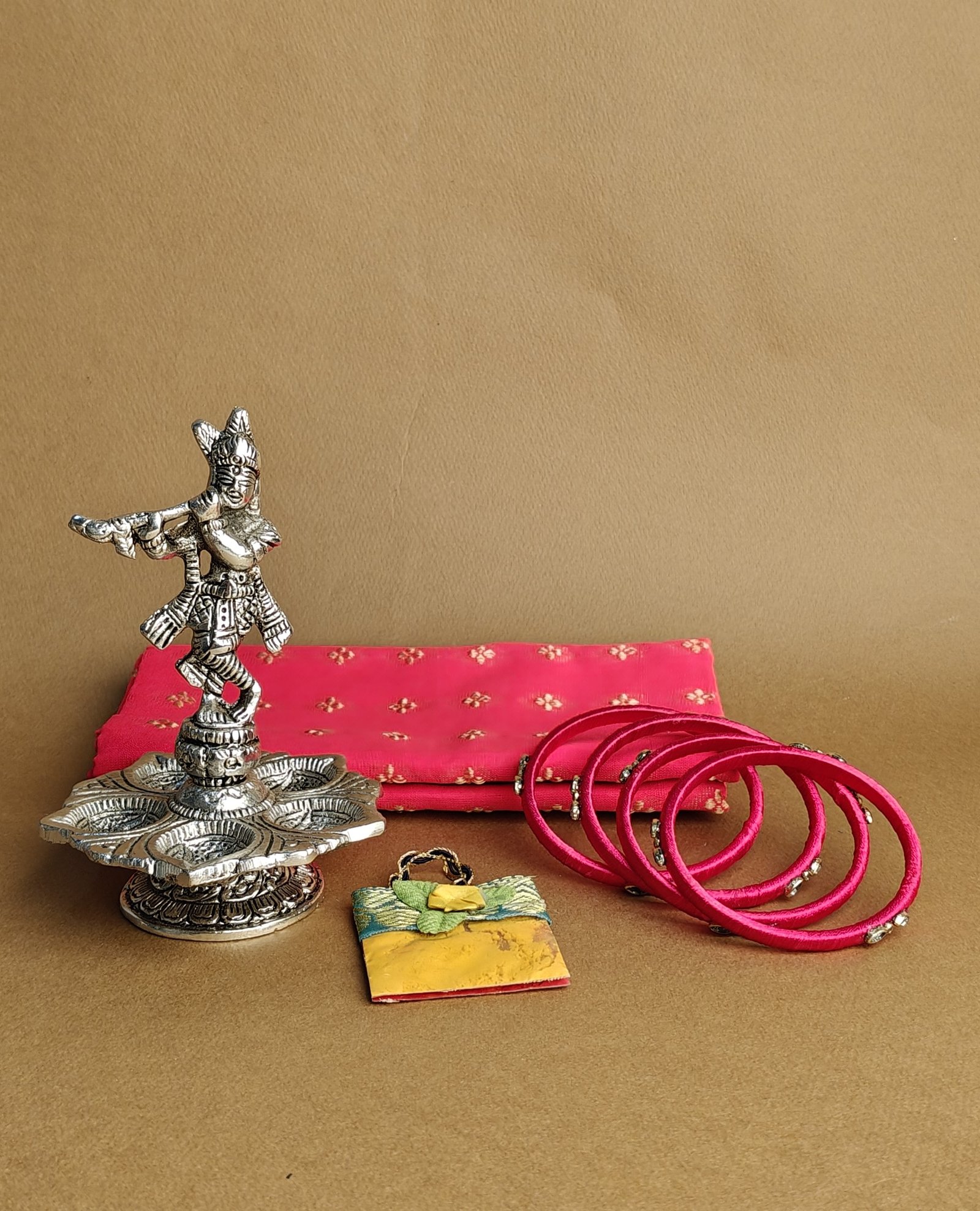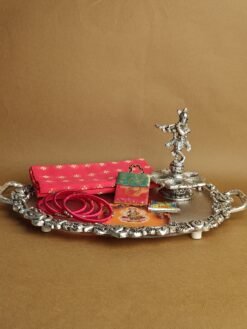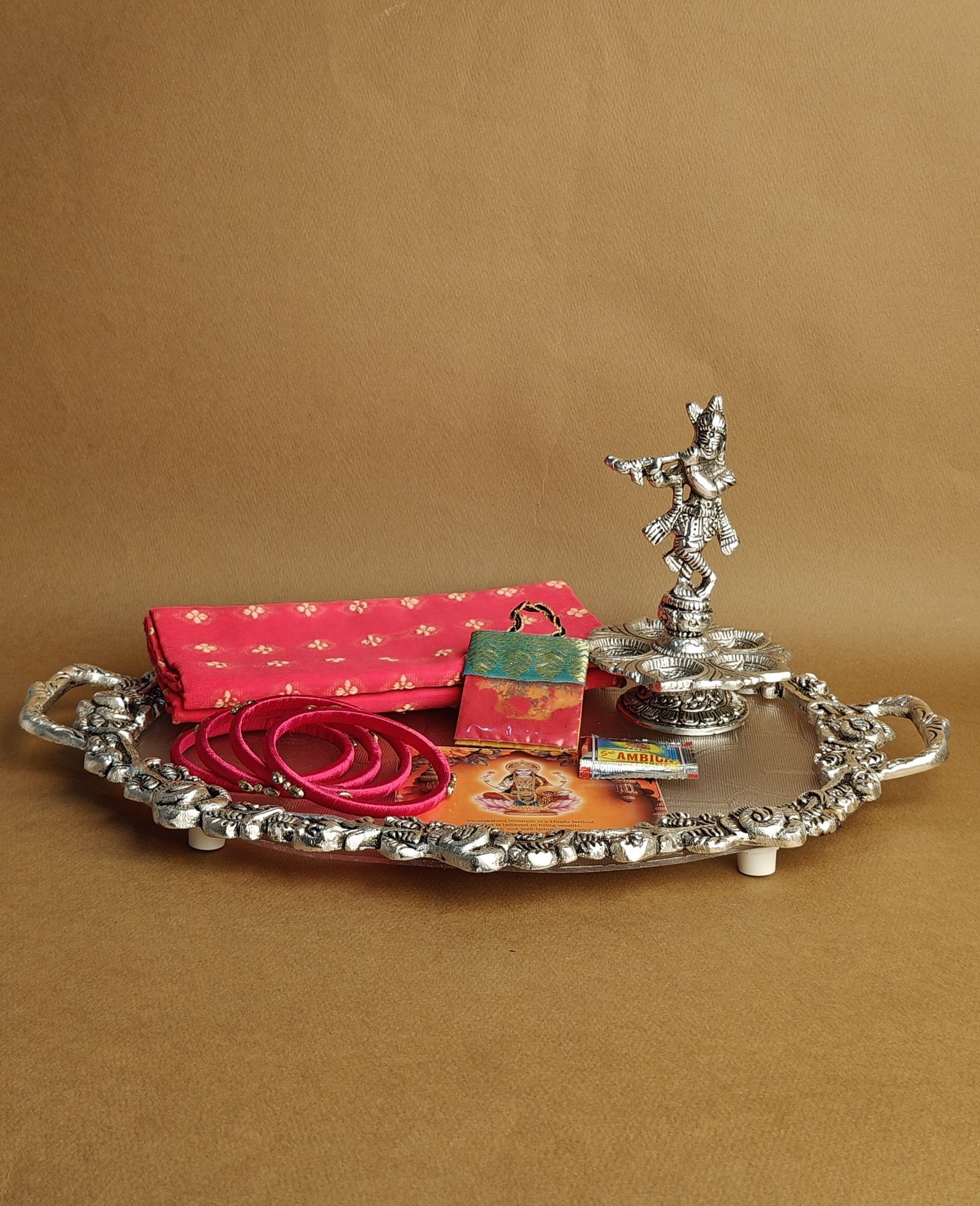 A premium hamper featuring a stylish acrylic tray adorned with German silver detailing. The included Krishna Diya adds spiritual charm and auspiciousness to the set. Perfect for poojas, festive gifting, and special occasions. A blend of elegance, tradition, and modern design.
