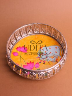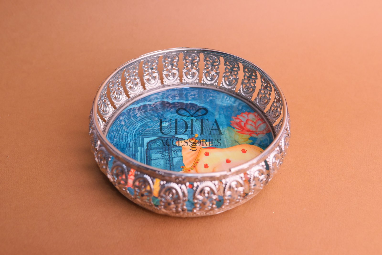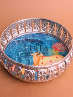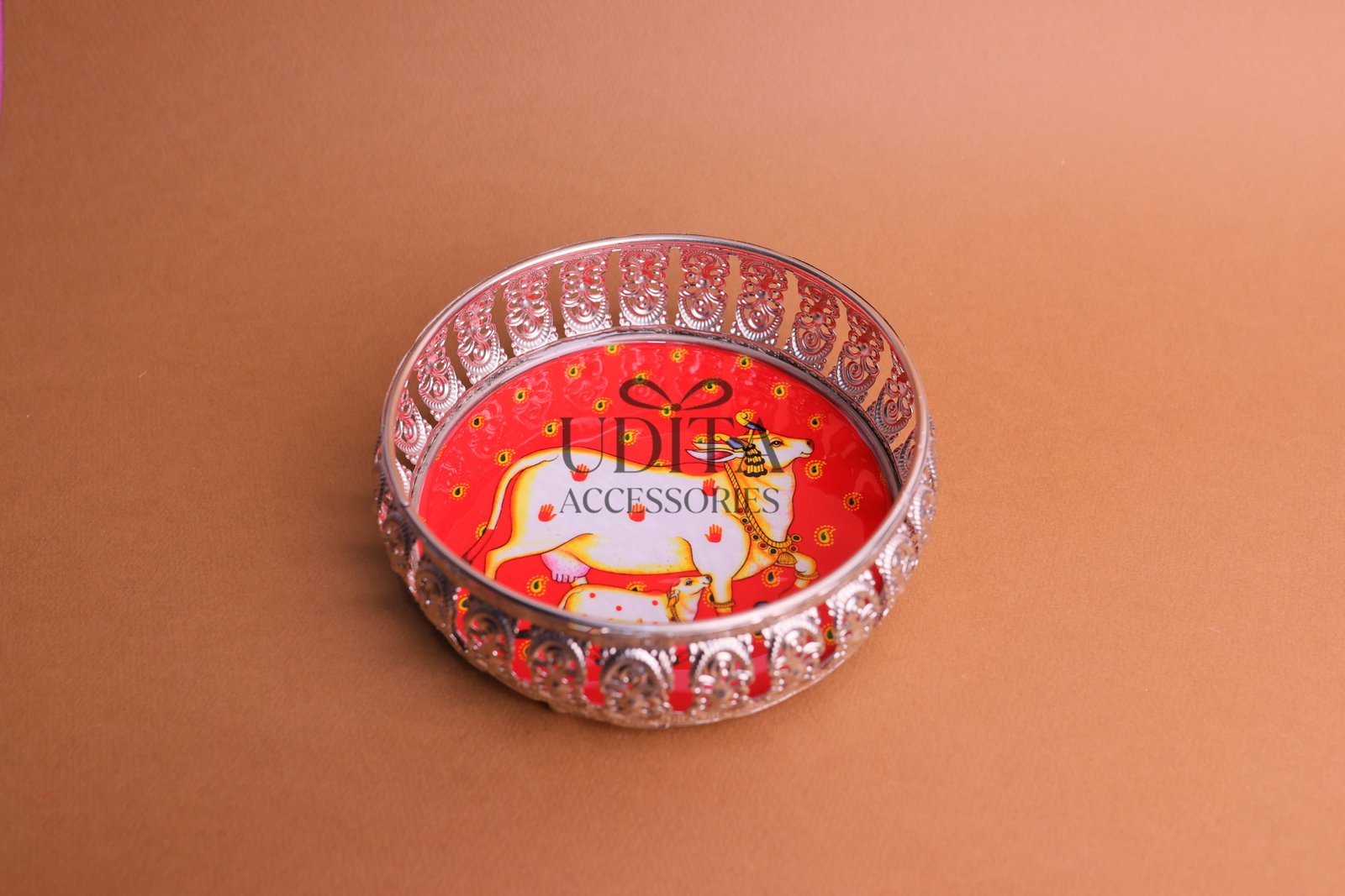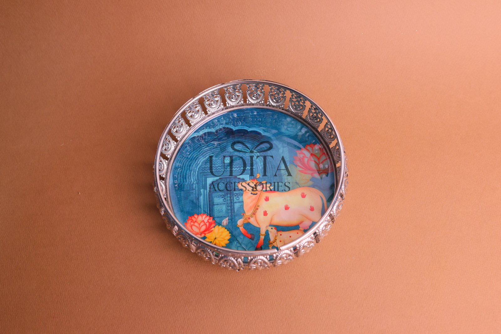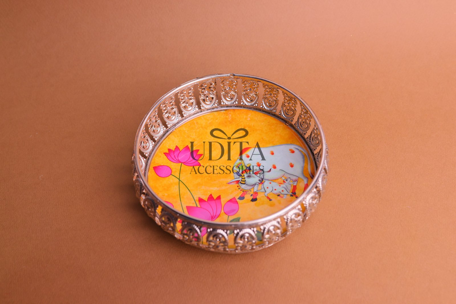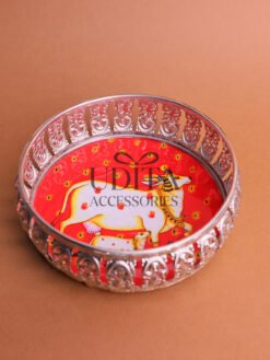 A beautifully crafted German Silver tray featuring intricate Pichwai artwork. The detailed embossing and polished finish make it perfect for pooja rituals, gifting, or festive decor. Its sturdy build and traditional design add elegance to any setup. Ideal for return gifts, home d?cor, or serving dry items in a graceful way.