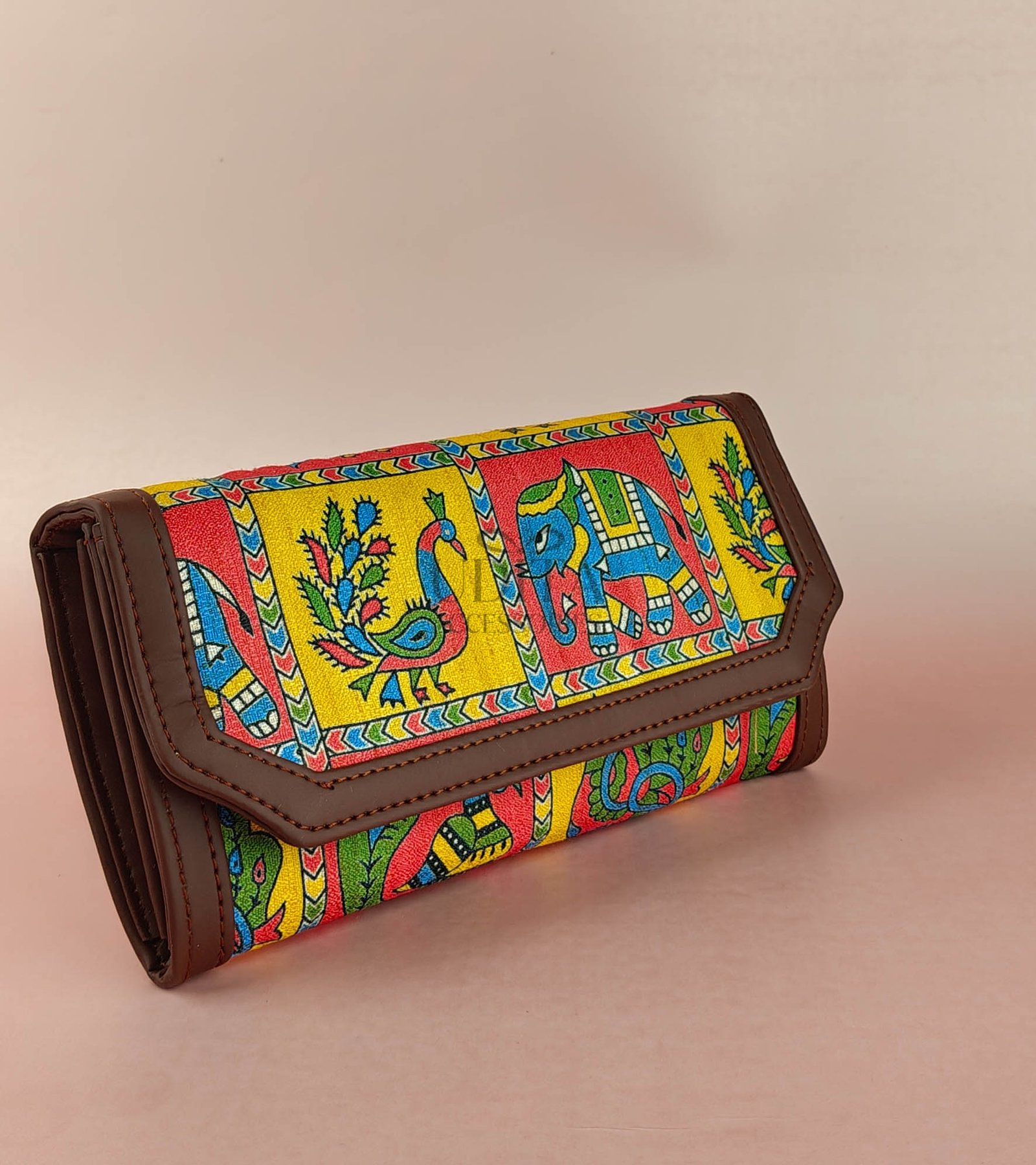 A unique clutch featuring traditional Madhubani art. Handcrafted look with vibrant colors and cultural charm. Perfect for ethnic wear and festive occasions. Lightweight and artistic.