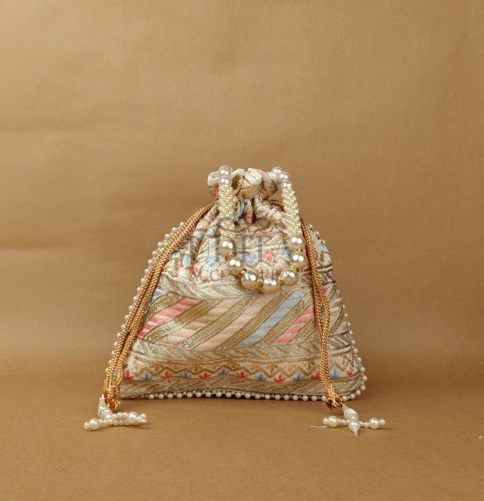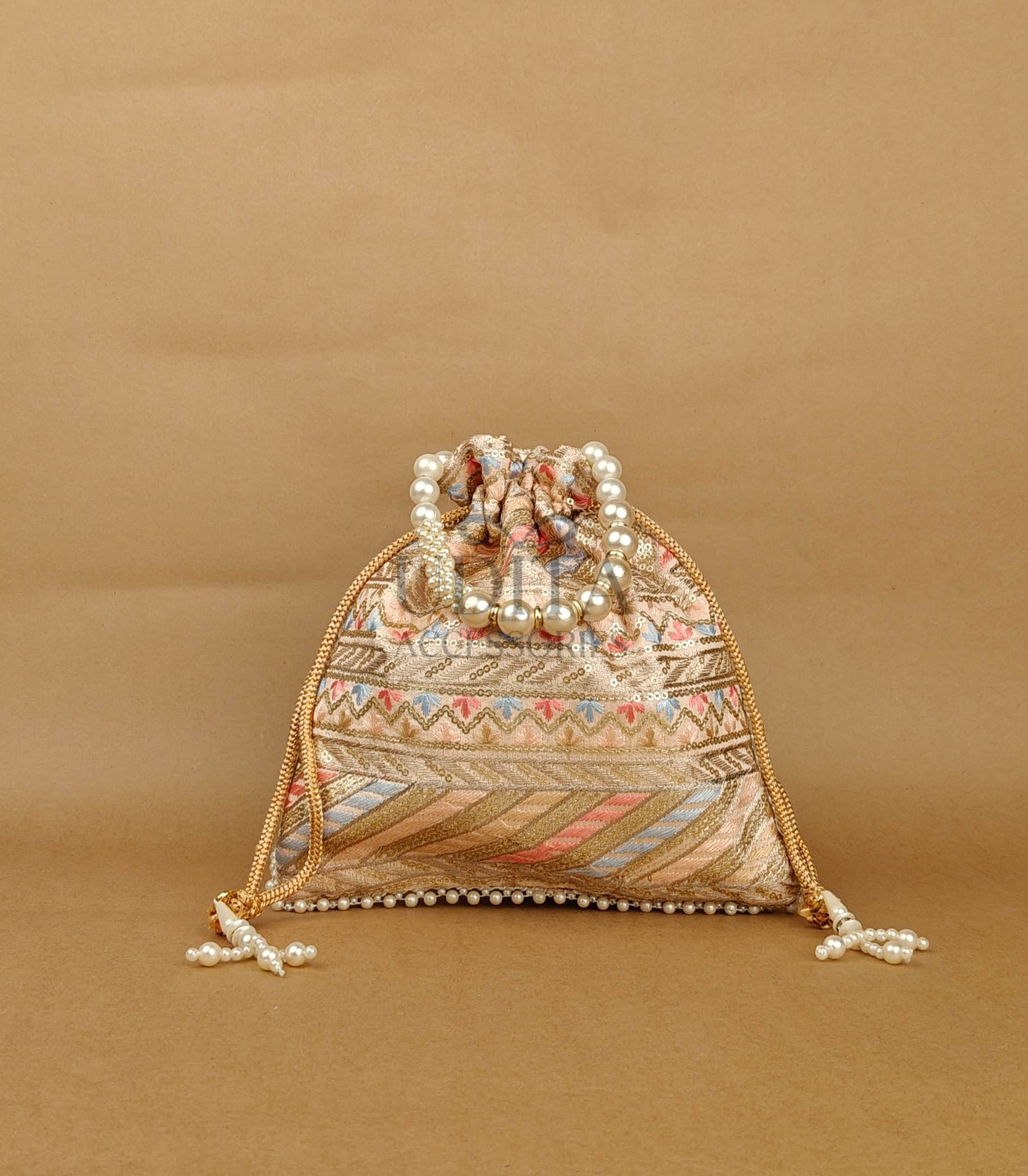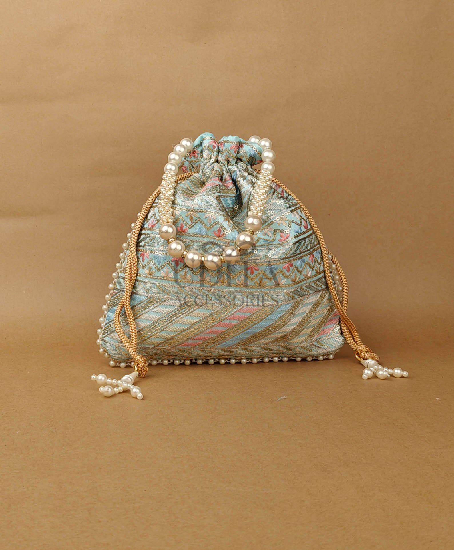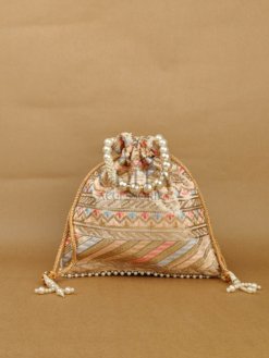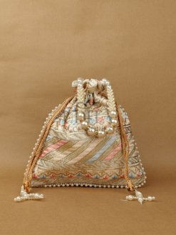 A richly designed potli made from pure raw silk with intricate heavy embroidery. Ideal for brides, festive occasions, and premium gifting. Spacious interior with a beautiful drawstring finish. Adds an opulent touch to your ethnic wear.
