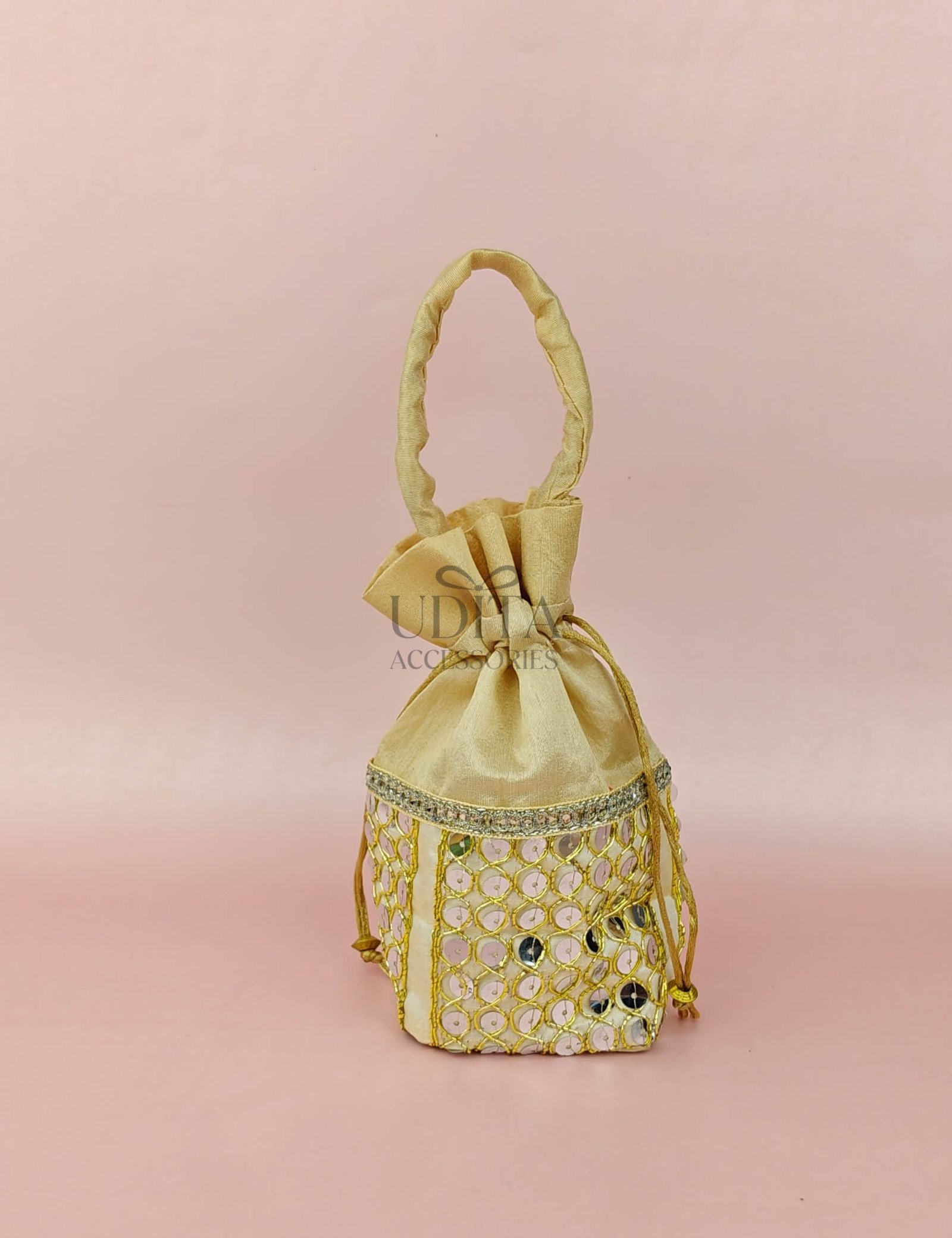 A lightweight, shimmering chamki potli ideal for tambulam gifting. Perfect for festivals, weddings, and vrat hampers. Compact, elegant, and easy to carry. Adds instant festive charm to your gift set.